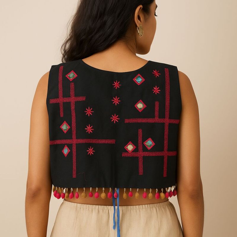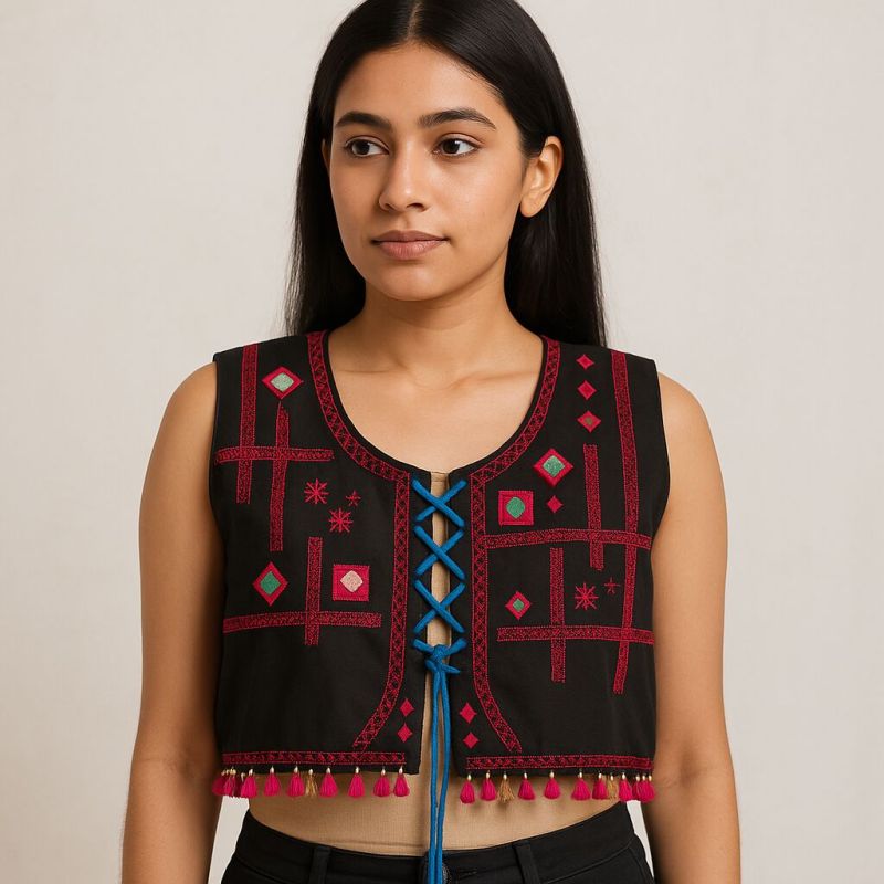 The cropped silhouette, tribal stripe patterns, and mirror detailing come together to create a versatile piece — whether you're pairing it with high-waisted jeans, a flowing skirt, or layering it over a saree or dress. No two jackets are ever alike — just like no two stories are.