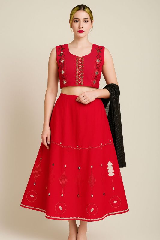 red lehenga choli mirror work, boho lehenga set for women, handcrafted Indian ethnic wear, tribal embroidery lehenga, Kesula Lambani outfit, artisan cotton lehenga choli, Banjara mirror embroidery, contemporary ethnic co-ord set
