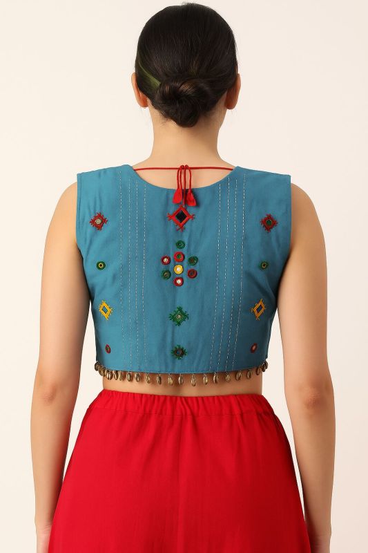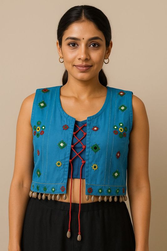 ethnic embroidered crop jacket, mirror work short jacket, Lambani embroidery jacket women, boho tribal cropped jacket, festival ethnic wear women, handcrafted mirror jacket, Kesula tribal fashion, cowrie embroidered jacket India, artisan embroidered cotton jacket