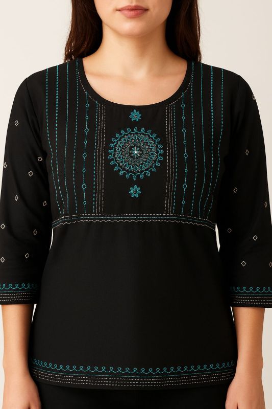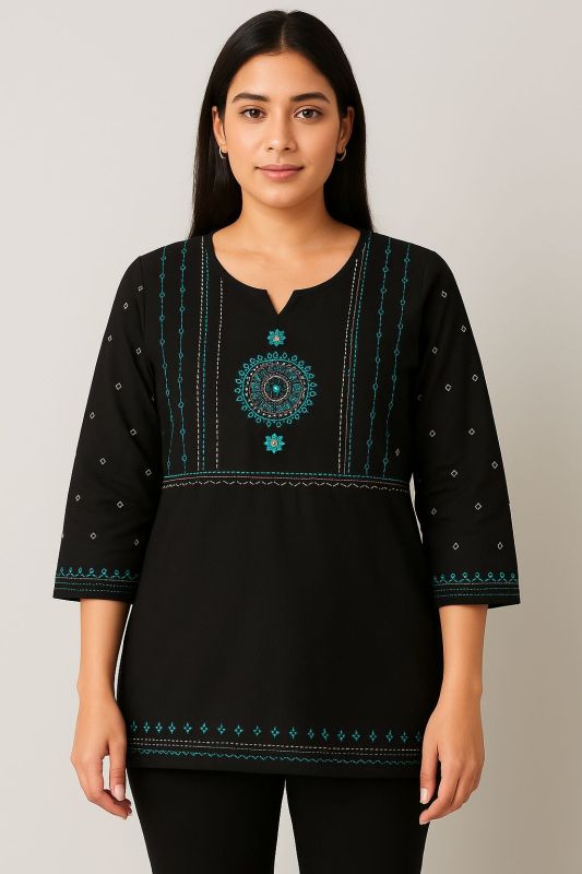 Elevate your everyday with the Kesula Black Embroidered Tunic Top, where minimalism meets ethnic artistry. This elegant black 3/4th sleeve cotton kurti-style top features precision Lambani-inspired embroidery in striking turquoise threadwork that accentuates the neckline, sleeves, and hemline. A handcrafted mandala motif sits at the heart, invoking symmetry, strength, and cultural richness.